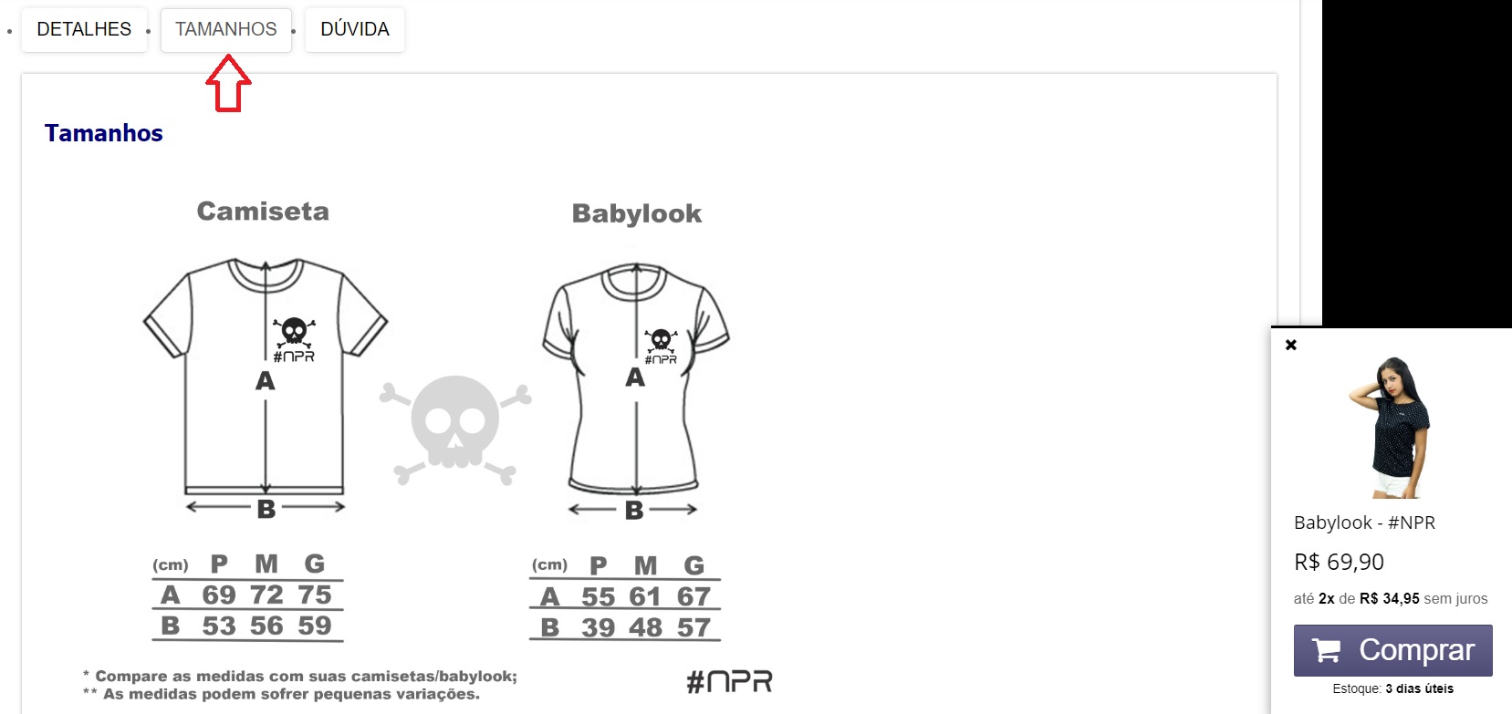 4.1- Verifique na tabela de medidas, escolha o tamanho que mais se adequar à sua necessidade e clique em comprar.